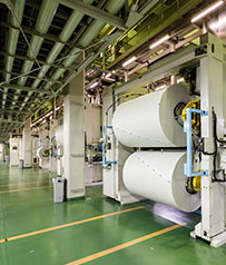 広いスペースに最新鋭の機械が効率的に配置されています。紙の品質などに配慮し、温度、湿度も一定に保たれています。